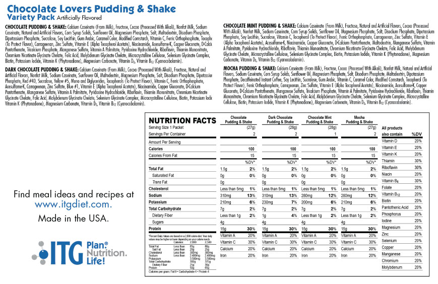 For all of our Chocolate Lovers! Enjoy a variety box of delicious puddings and shakes created just for you. Box includes: Chocolate, Dark Chocolate, Chocolate Mint, and Mocha Shakes/Puddings.