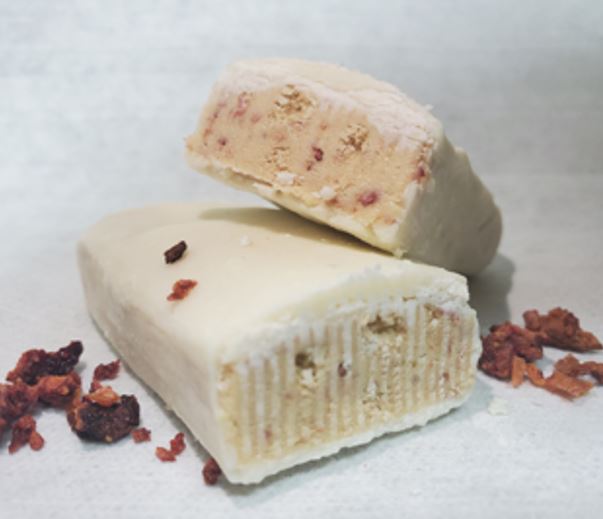 NEW! A sweet, chewy cheesecake dough bar with strawberries.