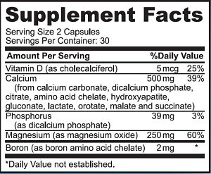 New Formula! Contains 5mg of Vitamin D which is essential for development, function, and maintenance of healthy bones and aids in the absorption and effectiveness of calcium. Also contains 2mg of Boron which is a trace element also responsible for building strong bones, muscles, thinking skills and muscle coordination. Ten forms of calcium work synergistically with magnesium to regulate their own levels in the body and preserve the bones, lowering likelihood of osteoporosis, some forms of arthritis, heart attack and kidney stones.