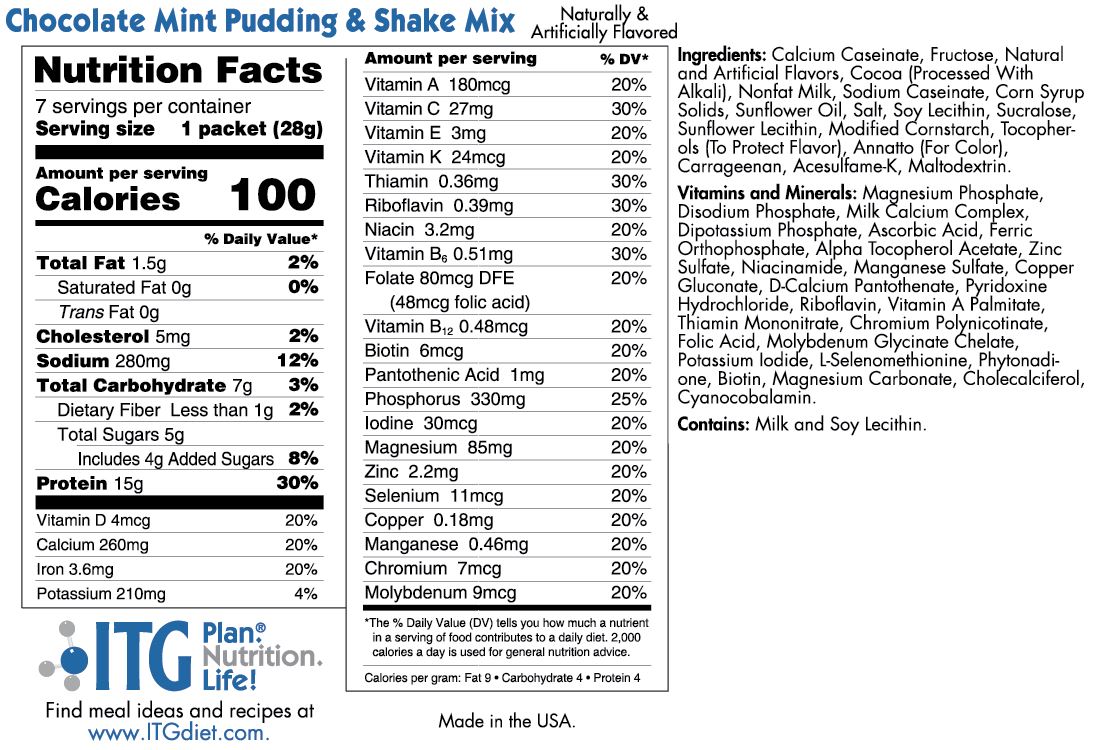 Rich chocolate mixed with zesty mint; can be enjoyed as a shake in the ITG Blender Bottle or as a refreshing pudding treat by following the instructions and using less water.