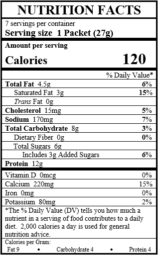 Calcium Caseinate (From Milk), Cream Cheese (Pasteurized Milk and Cream, Cheese Cultures, Salt, Carob Bean Gum), Nonfat Milk, Fructose, Milk Protein Isolate, Sugar, Modified Cornstarch, Natural and Artificial Flavors (Includes Soy, Tree Nuts [Walnuts] and Egg), Konjac (Thickener), Maltodextrin, Sodium Phosphate, Cheddar Cheese (Cultured Milk, Salt, Enzymes), Whey, Lactic Acid, Buttermilk, Salt, Corn Syrup Solids, Disodium Phosphate, Sucralose, Tricalcium Phosphate, Beta-Carotene.